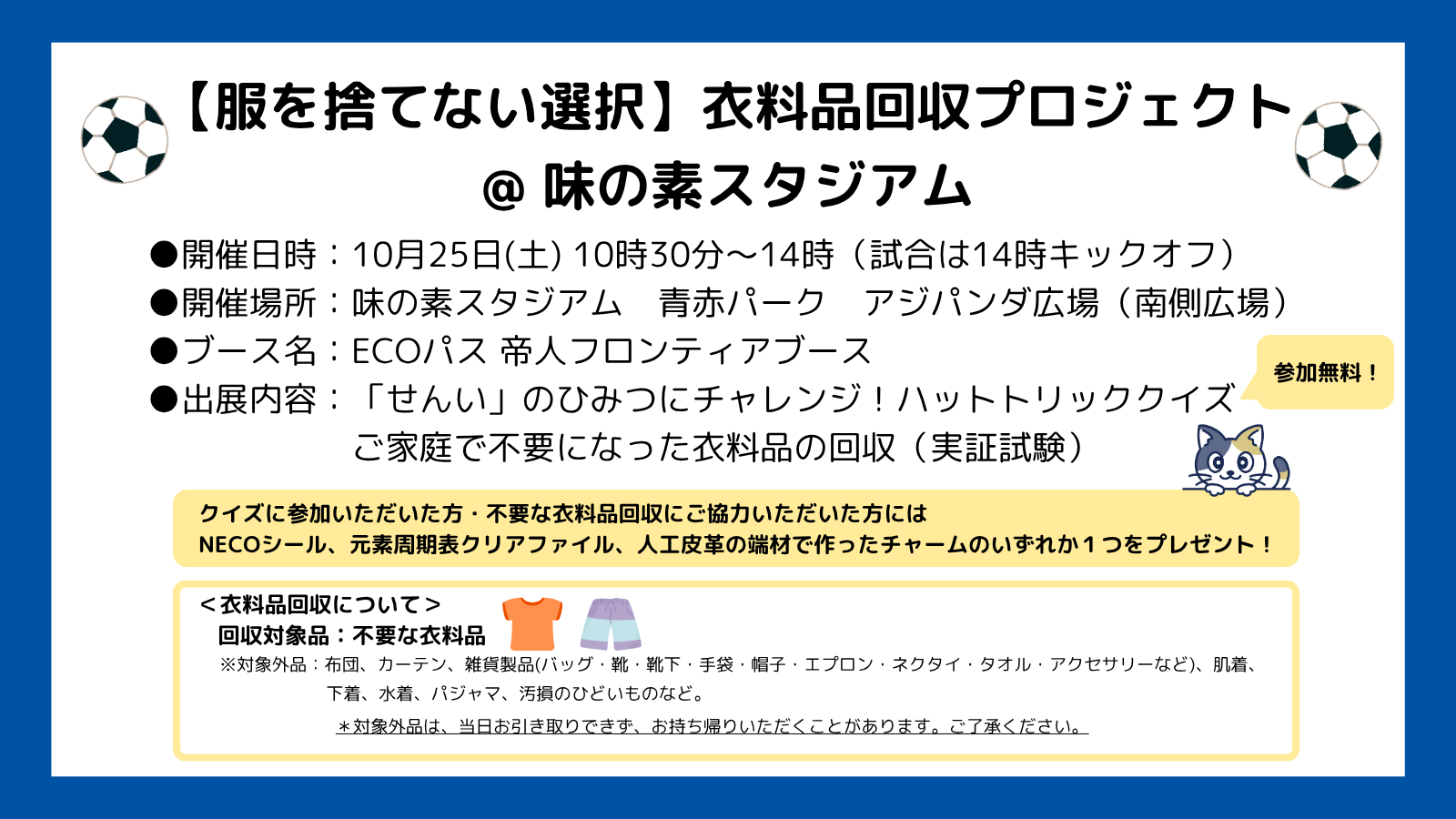 【お知らせ】~「服を捨てない選択」衣料品回収プロジェクト~ ECOパスブースを味の素スタジアムに出展