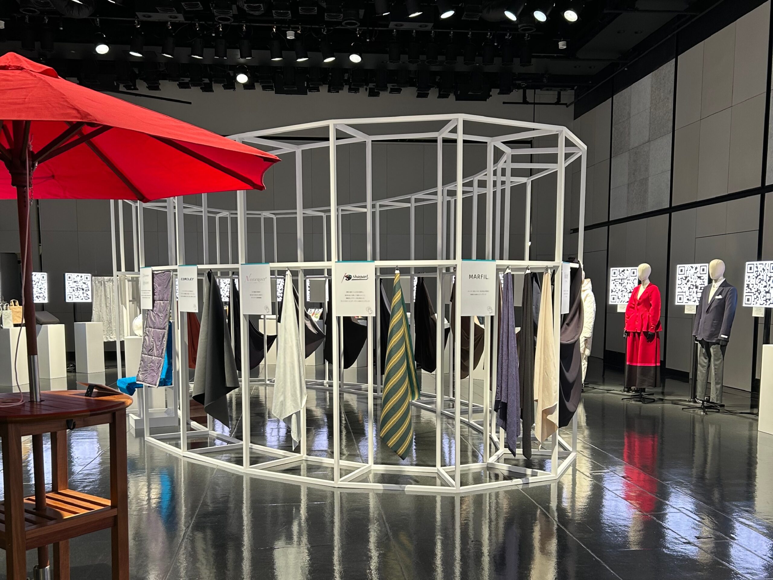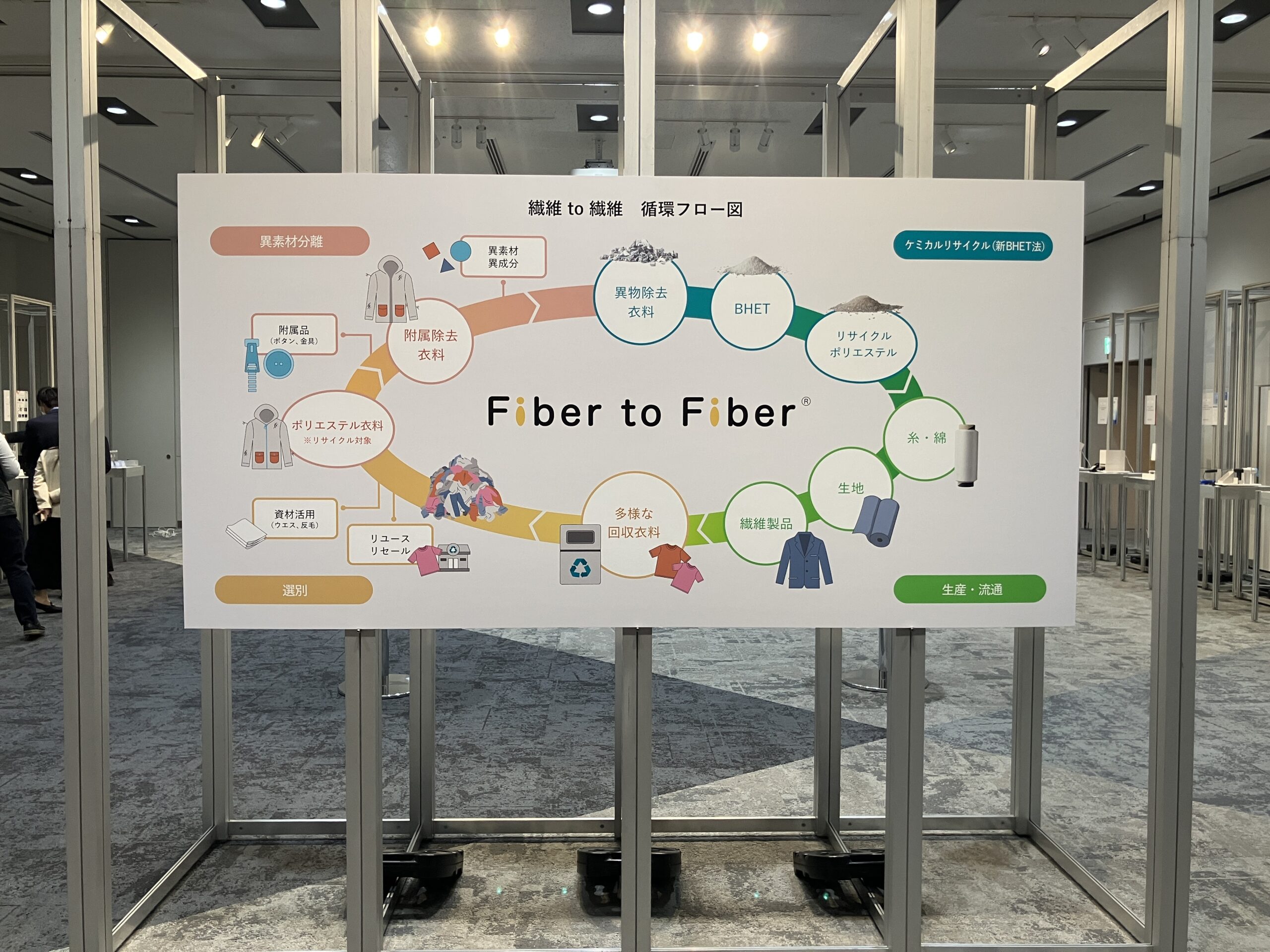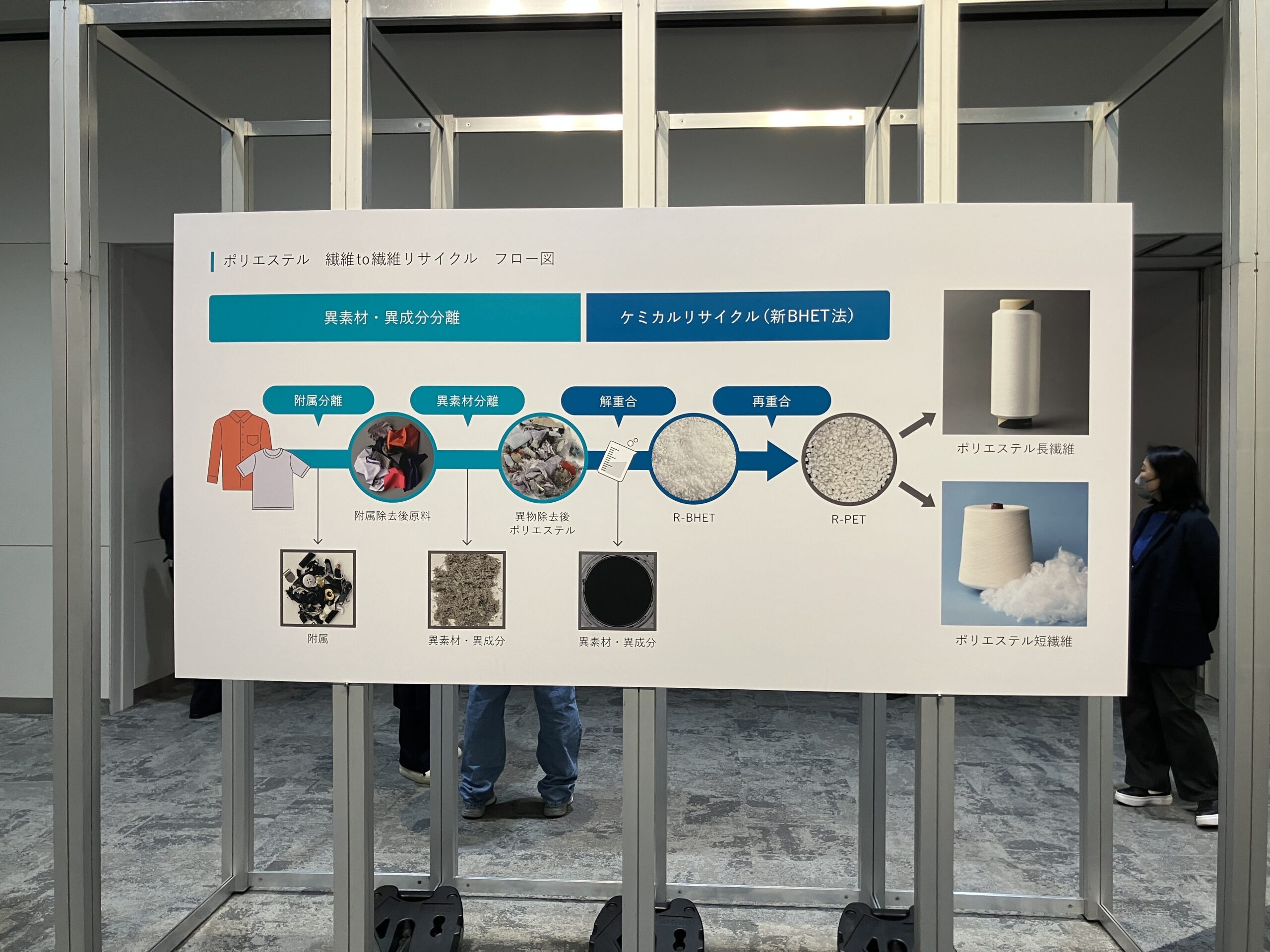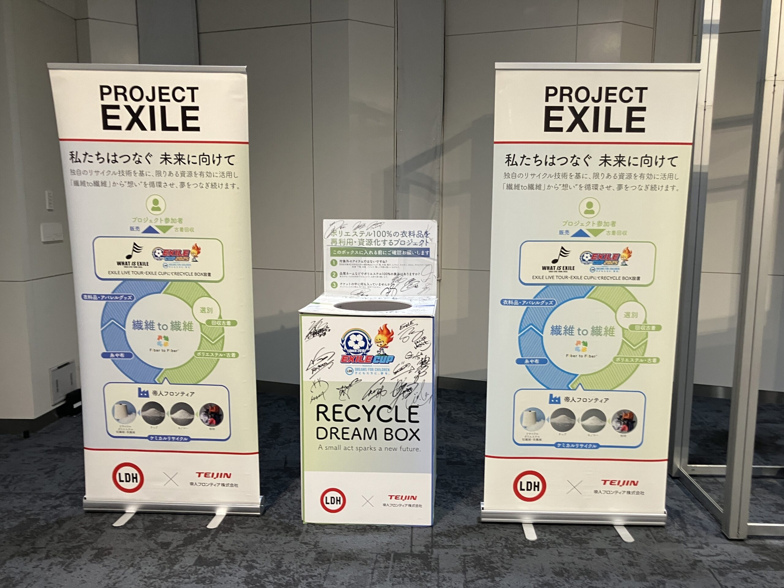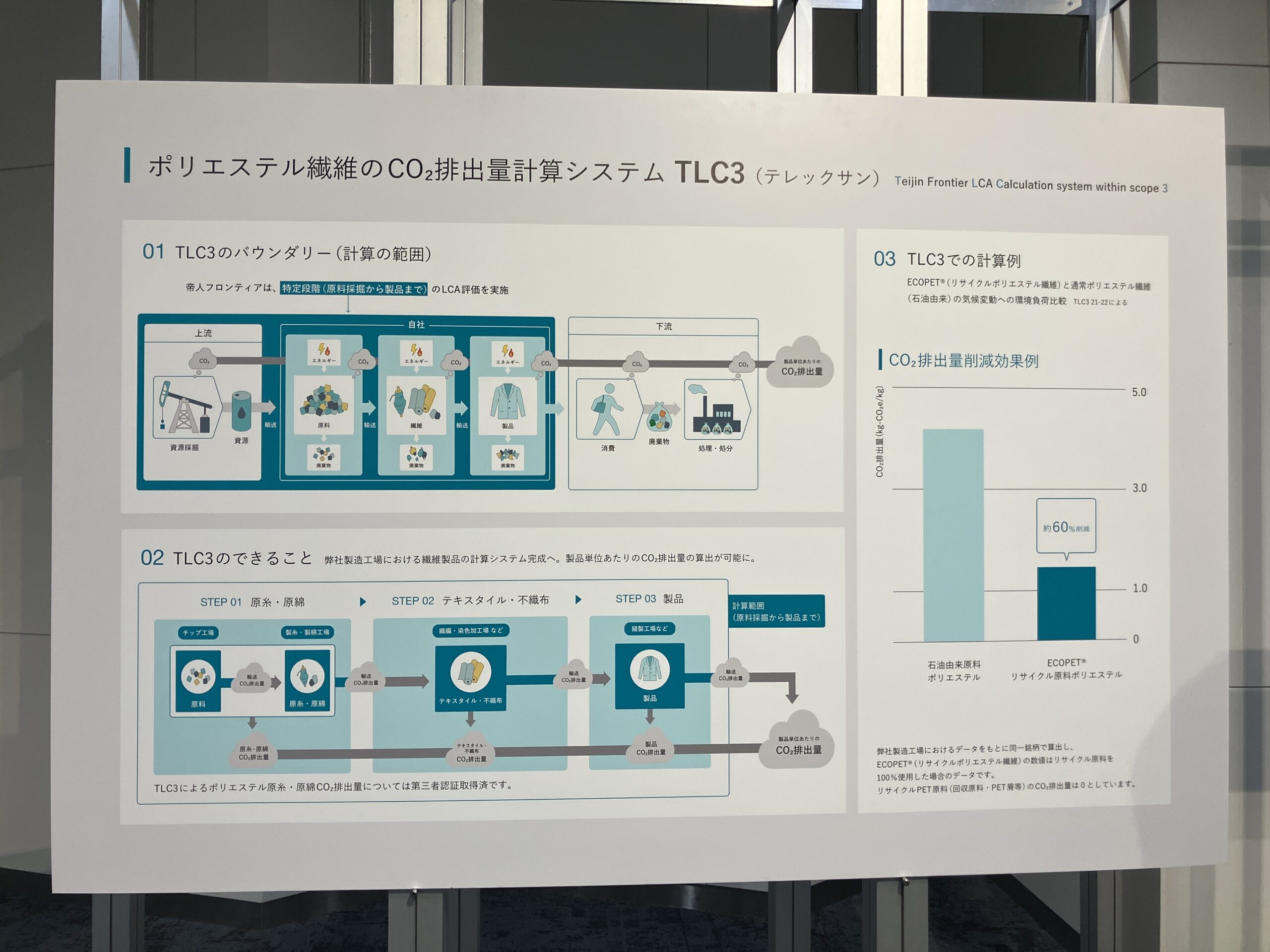 サステナビリティ関連では、「繊維to繊維」循環フロー図やポリエステルのリサイクル工程、ポリエステル繊維製品のCO2排出量算出システム「TLC3(テレックサン)」の紹介パネルを展示。また、PROJECT EXILE第6弾としてLDH JAPANとともに取り組む「繊維to繊維」サステナブルな社会の実現に向けたプロジェクトも紹介しました。
